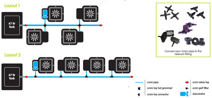 The system can be put together in different ways depending on your circumstances. Set-up is actually very simple – see the diagram for examples. All you need to do is run 6mm pipe from the 47 litre reservoir to your Aquavalves. The Aquavalves sit inside each tray, filling them up to a level of 20mm as and when needed.
