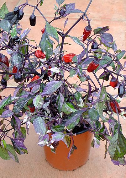 Here we have approximately 20 seeds of Calico chilli pepper (Capsicum annuum).  This is a stunning chilli plant that looks fantastic on a windowsill or in a conservatory or greenhouse.  The stems are purple, the leaves a vibrant mix of green, purple, pink, and white.  The purple flowers produce very hot, oval-shaped fruit that measure 12 x 25mm an turn from deep purple (almost black) to red.